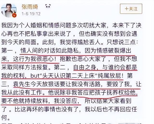 一手好牌,打得稀烂!       她是周星驰力捧的星女郎,出道即巅峰,手握内娱顶级资源。       可谁也没料到,这一切都栽在了感情上,也让风流的张雨绮       付出了惨痛代价……       高调情史:从闪恋到互撕的恶性循环       张雨绮的感情,从来都是轰轰烈烈开场。       2009年上海电影节,经王中磊介绍,她认识了汪小菲。       两人迅速热恋,汪小菲还帮她解决了与星辉公司的合约纠纷,把她引荐到华谊。       那段时间,机场激吻照传遍全网,所有人都以为这是金童玉女的标配。       可这段感情没撑过两年,2010�月,汪小菲与大S订婚的消息曝光。       张雨绮才在微博承认分手,说两人性格不合适。       面对媒体追问,她还硬气回应,自己只是经历失败感情,既不失意也不失身。       谁能想到,转身她就开启了更快节奏的感情。       拍摄《白鹿原》时,她和导演王全安相恋,四个月就领证结婚,后来还在马尔代夫办了盛大婚礼。       当时她直言,第一眼就觉得王全安是孩子的父亲。       可这份笃定,�年碎得彻底,王全安因嫖娼被北京警方抓捕,消息震惊全网。       2015年,张雨绮发文离婚,一句“愿你好,祝我安”赚了不少同情分。       可同情没持续多久,她就又一次闪婚,2016年,和认识�天的袁巴元领证。       这段婚姻更像一场闹剧,先是被曝是小三,继女生母葛晓倩直接发文对峙,说她拿孩子作秀。       接着袁巴元的简历造假、失信记录、欠薪欠债等问题全被扒出,甚至有千万赌债传闻。       最狗血的�年的家庭纠纷,袁巴元报警,说被张雨绮用水果刀划伤背部。       两天后离婚声明发出,本以为到此结束,结果张雨绮又在微博说单身女人可以接受前夫追求,承认复合。       没过多久,袁巴元曝光她婚内出轨,两人在社交平台互撕,从感情骂到金钱,体面尽失。       离婚后的张雨绮,不再喜欢功成名就的大叔,开始偏爱小鲜肉。       和小提琴手李柄熹公开恋情,带他上恋综,还为他量身筹备剧本,让非科班的他空降男二。       可这段感情也以分手收尾,她甚至在直播中哽咽吐槽“有些人喂饱就翻脸”。       之后,与张墨怀的婚纱店亲密照、和于适的暧昧互动,同CBA球员刘子琪的短暂恋情,绯闻从未间断,每一段都来得快、去得急。       代价显现:事业崩塌与口碑滑坡       频繁的感情闹剧,最先拖垮的是她的事业。       早年凭借《长江七号》成名,《美人鱼》里一句“追我的人从这里排到法国”,让她坐稳大女主宝座。       可《美人鱼》之后,她再没拿出像样的作品。       观众渐渐发现,张雨绮的身影更多出现在综艺里。       演艺重心彻底偏移,演员的核心竞争力慢慢丢失。       当同期女演员在钻研演技、冲击奖项时,她还在靠感情绯闻博眼球。       业内人士透露,她的争议体质让导演不敢用,不少谈好的角色都被替换。       真正让她口碑翻车的,是直播里的无心之语。       2023年直播带货时,面�元的羊毛被,有网友觉得价格高。       她却脱口而出,699元都买不了袜子。       这话瞬间引爆网络,“炫富”“脱离群众”的批评声铺天盖地。       短短几天,她掉粉超�万,商业价值直线下跌。       为了挽回人气,她开始走网红路线。       拍短视频时戴猫耳朵特效,挤眉弄眼跳网红舞。       这和她之前霸气的御姐形象反差太大,让不少老粉心寒。       有网友直言,曾经期待她成为下一个巩俐,现在只剩惋惜。       根源所在:失控的感情观与安全感缺失       张雨绮的感情混乱,不是偶然,她在采访中曾明确表示,赞同女性可以同时和多个男生交往,还说青春期短,不知道哪个是错的。       甚至面对有妇之夫的追求,她也觉得只要对方爱自己,就不算大问题。       这种开放的感情观,让她在关系里毫无束缚。       喜欢就主动出击,不合适就果断分开。       她自己也说,没有离不掉的婚,也没有结不了的婚,哪怕失败三四次也不怕。       可这份敢爱敢恨,慢慢变成了冲动盲目。       深层原因,是她内心的安全感缺失,三岁时父母离异,她在单亲家庭长大,童年还被冠以贬义绰号,留下了心理创伤。       大学时家庭拮据,母亲变卖首饰才凑齐她的学费。       贫穷的滋味让她极度渴望掌控感,而频繁的感情和物质投入,成了她填补内心空洞的方式。       可她没明白,靠物质维系的感情,终究不长久。       每一段仓促开始的关系,每一次高调的分分合合,都在消耗她的口碑和资源。       她以为掌控了感情,实则被感情掌控。       张雨绮的跌落,是性格的必然。       一手好牌,毁在混乱的感情里。       曾经的光环早已黯淡,留下的只有争议和惋惜。       感情里的放纵,终究要靠事业和口碑来偿还。